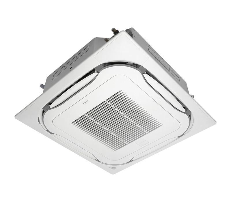 Кассетные сплит-системы Daikin серии FCAG-B типовое решение для помещений большой площади - магазинов, ресторанов, офисов. Кассетные блоки встраиваются в подвесной потолок, закрываются снизу декоративной панелью с фильтром и заслонками регулирования подачи воздуха. Воздушный поток подается под углом к плоскости потолка в четырех направлениях. Угол отклонения потока можно регулировать (синхронно по вертикали).Антибактериальная поверхность пульта исключает контактный перенос бактерий и вирусов при передаче его другому пользователю. Наличие датчика изменения температуры на уровне пола позволяет комфортно распределять воздух в помещении, а работа датчика присутствия людей приводит к снижению энергопотребления.