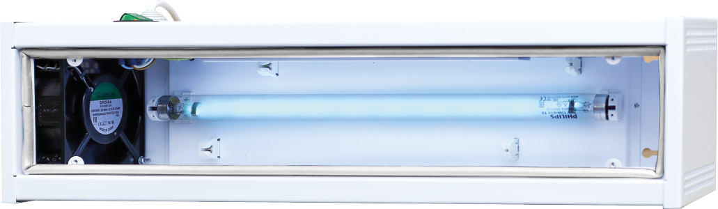 Светильник обеззараживающий бактерицидный рециркулятор «СОБР». Металлическая конструкция имеет высокую прочность. Установлены высокачественные и надёжные лампы производства PHILIPS и OSRAM. На боковой стороне корпуса установлены сетевой выключатель со светодиодным индикатором, сигнализирующим о наличие напряжения сети и горения бактерицидной лампы.